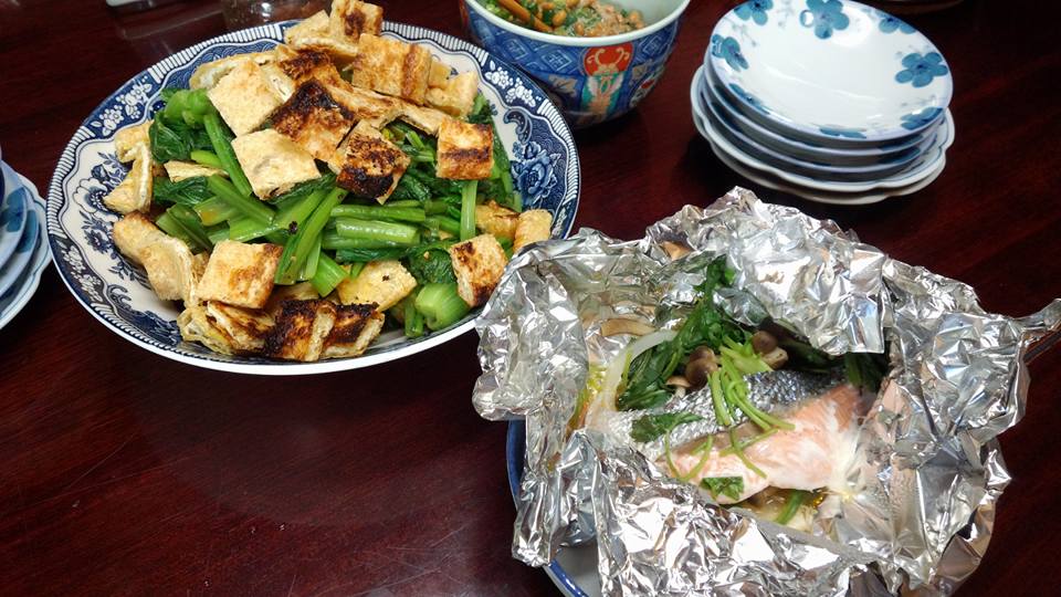 今日の織屋の賄いは、小松菜とお揚げさんの辛子和え、鮭のホイル蒸しでした。