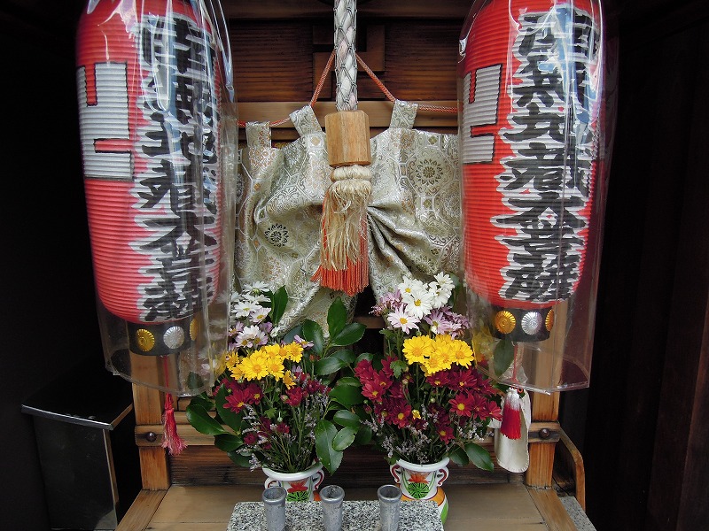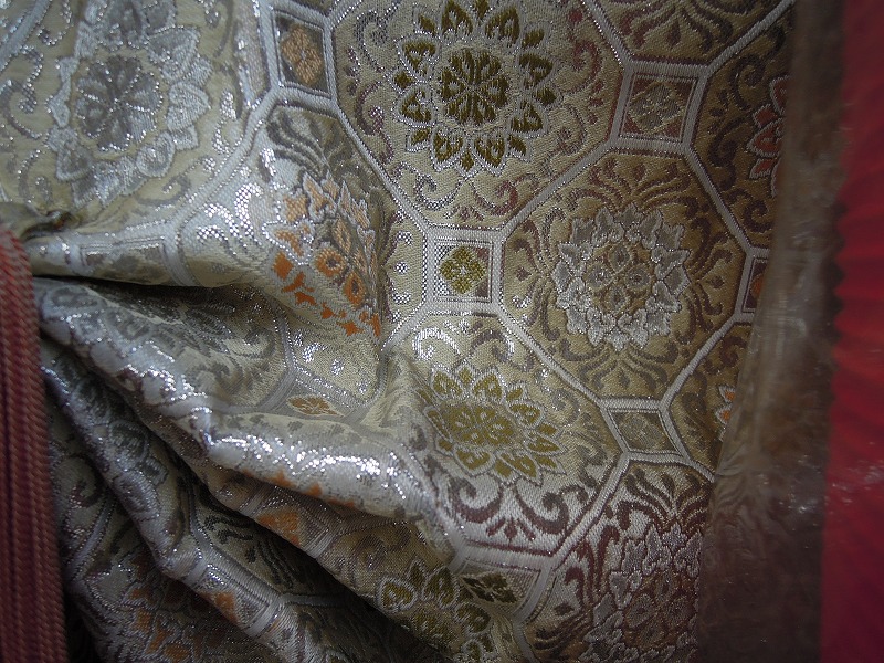 金襴の幕がかかっておりました。蜀甲唐花。白地?白茶地?銀色の箔に見えますがたぶんアルミ箔が褪色して銀色になってるんでしょう。それを、抑えるには「本金箔」が一番!