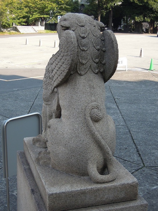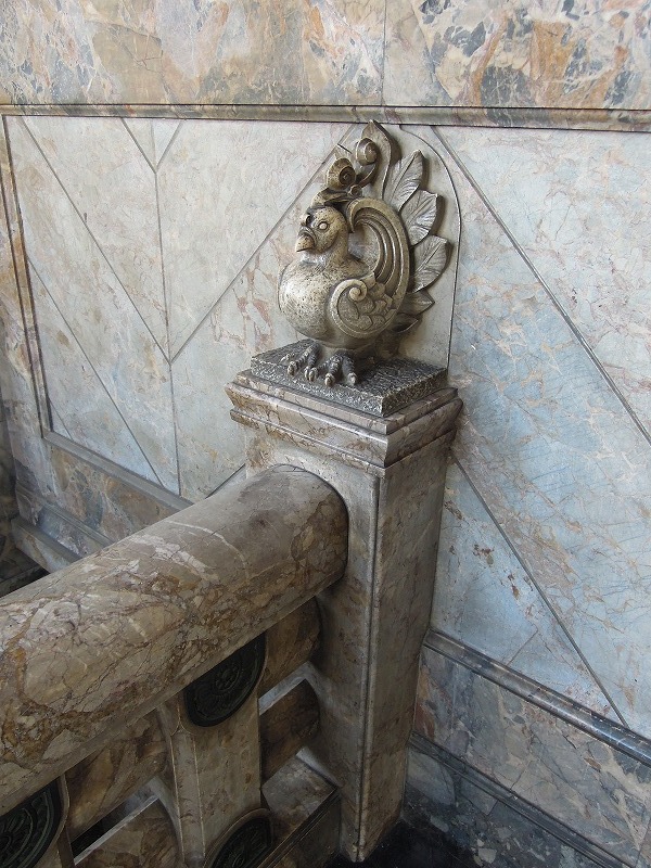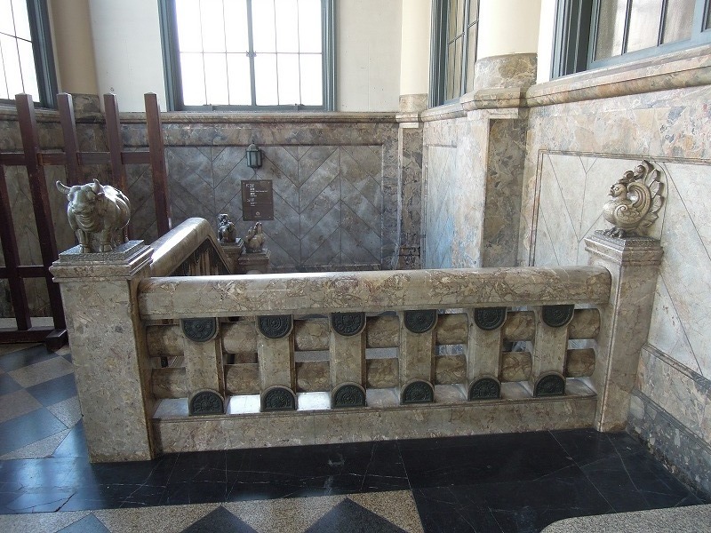 本殿の左側(地図的に平行にみたら銀座1丁目方面。もしくは日本橋、東京駅方面)に地価に行く大理石の階段。こういうところにさりげなく可愛い彫り物があるのよね。