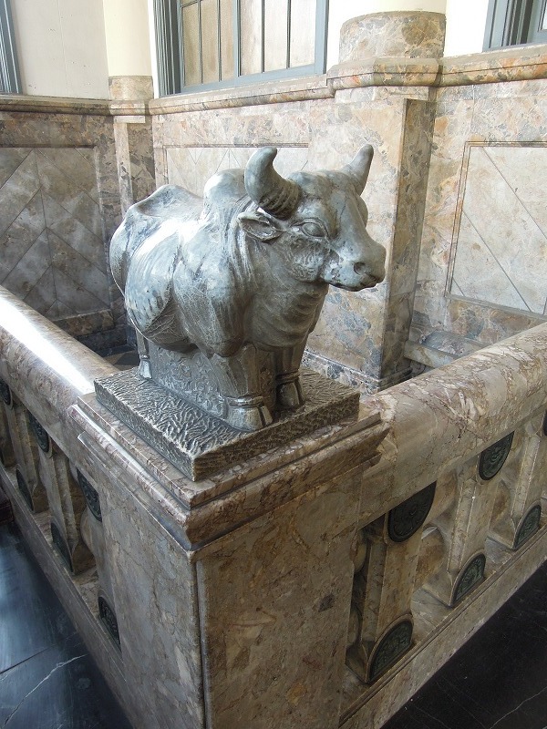 あら、牛さん。もっとインディな感じ。なぜにこんなにインディなのかと言うと築地本願寺は「古代インド様式」という建築なのです。1934年の東京帝国大学工学部教授・伊東忠太による設計なのです。伊東さんは当時の浄土真宗本願寺派法主・大谷光瑞(おおたに こうずい)と親交のあったお方。大谷光瑞さんは探険家でもあって、1902年に西域を探検する為にインドに行き、仏蹟(釈迦の遺跡)を発掘調査しはりました。そして釈迦ゆかりの「霊鷲山(釈迦仏が無量寿経や法華経を説いたとされる山として知られる)」という仏蹟を発掘。