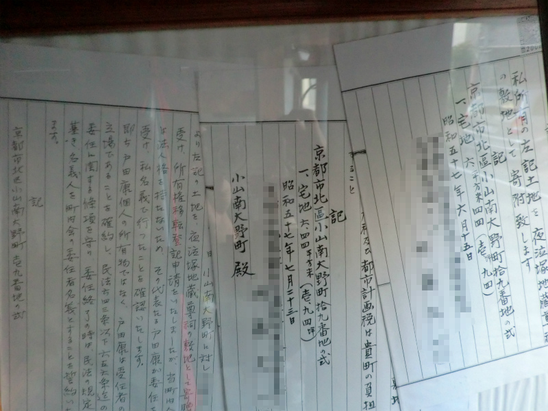 下の書類はこちらの土地の持ち主だった方が土地をこの町内に寄付したという登記簿やなんやら。「町内」は法人格がないからなんやら・・・と書いてあり、やはりお地蔵さんの土地も「所有者問題」があるんやな、と思いました。これは気前良く寄付してもらえた雰囲気です。