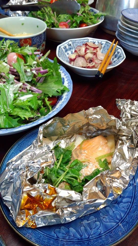 今日の金襴織屋の昼御飯。ホイル蒸し(人参、小蕉、三つ葉、鮭、ごま油をちょっと