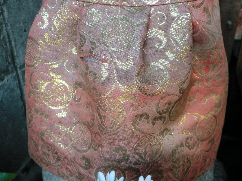 色はあせていますが金襴発見。「三つ葵に茗荷散し唐花紋」・・・ここらへんに業者が住んではって何かの余り布で仕立てたとかいう感じ☆橋の欄干のようなお地蔵さんですね。