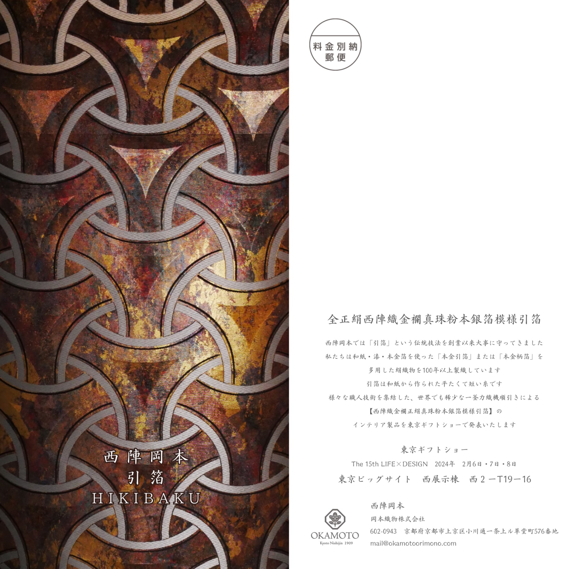 柄箔の見え方に強弱が出るように組織を工夫し、更にジャカードによる紋様を織り重ねる事で奥深い織物にしています。 https://okamotoorimono.com/