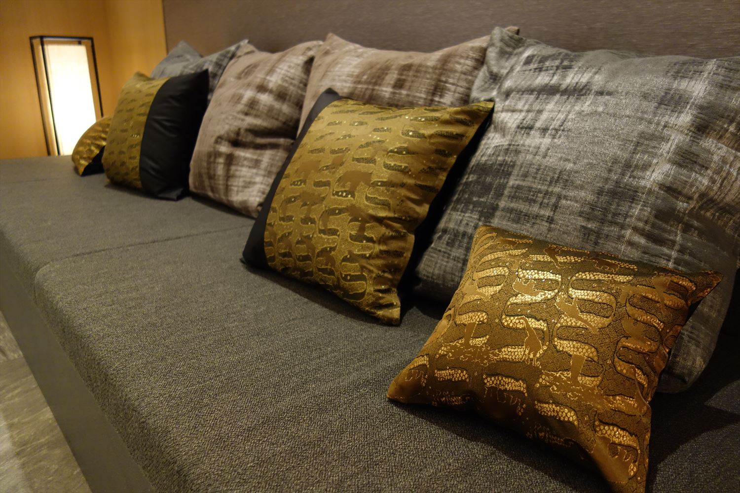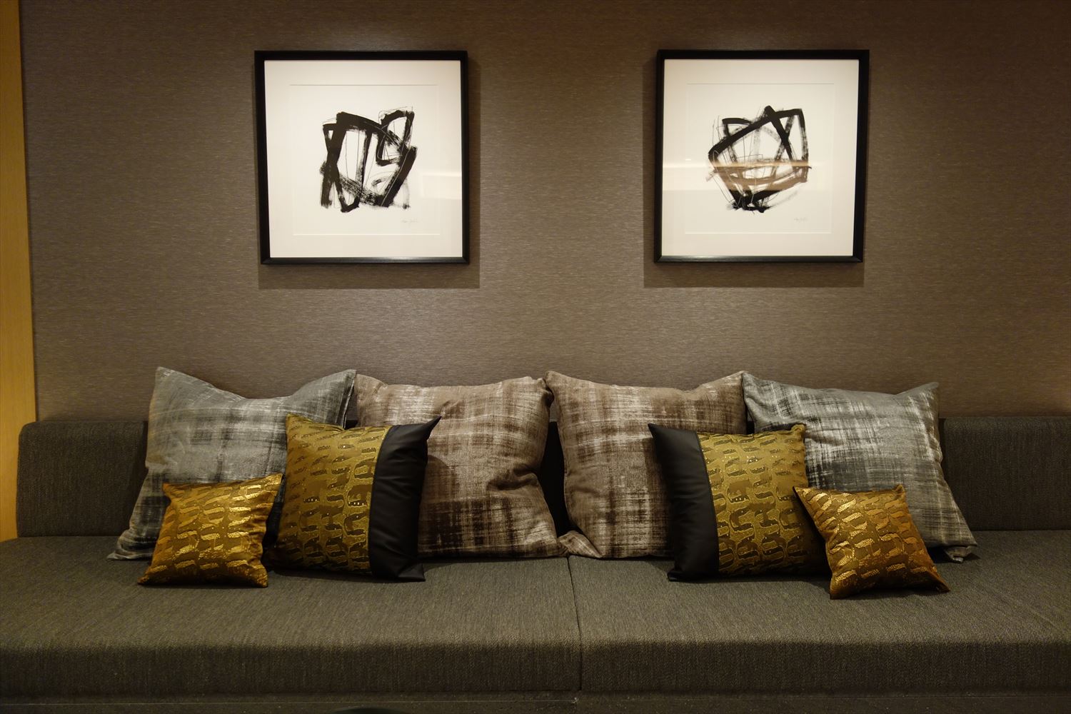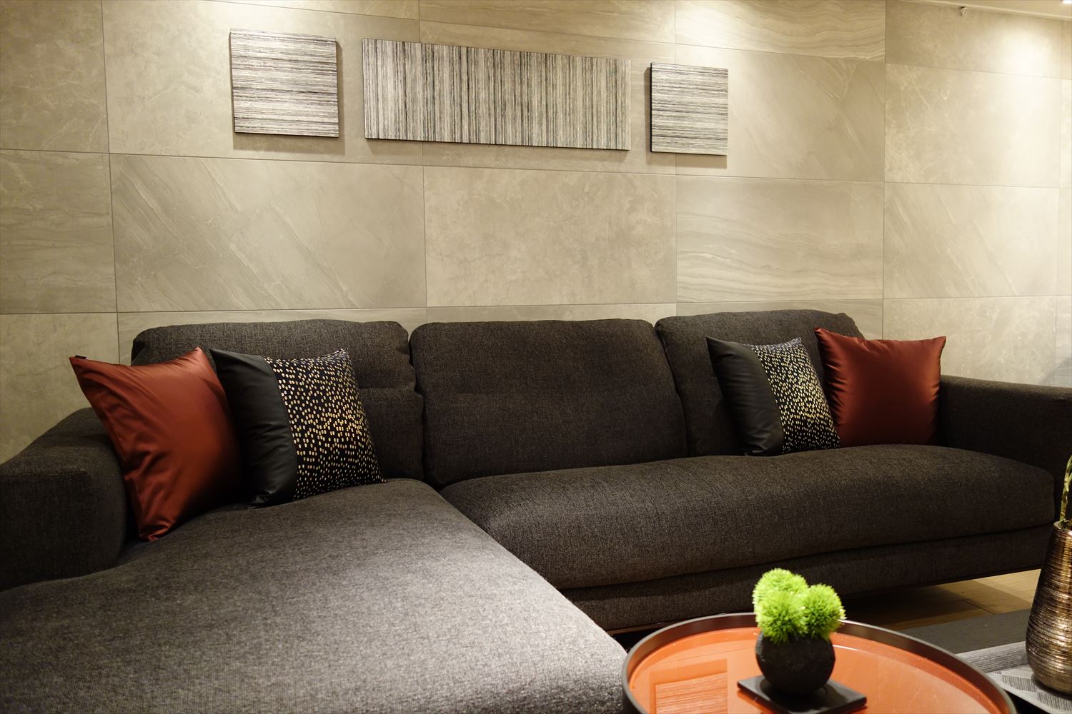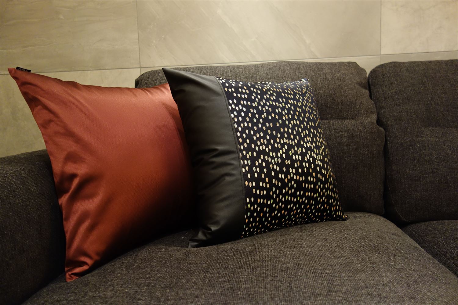 弊社オリジナルの 西陣織 金襴 滴紋様の絹織物をお使いいただいたクッションカバーがリビングをシックに彩ります。