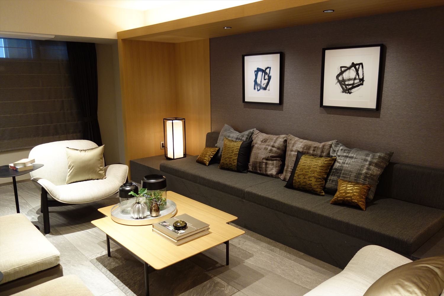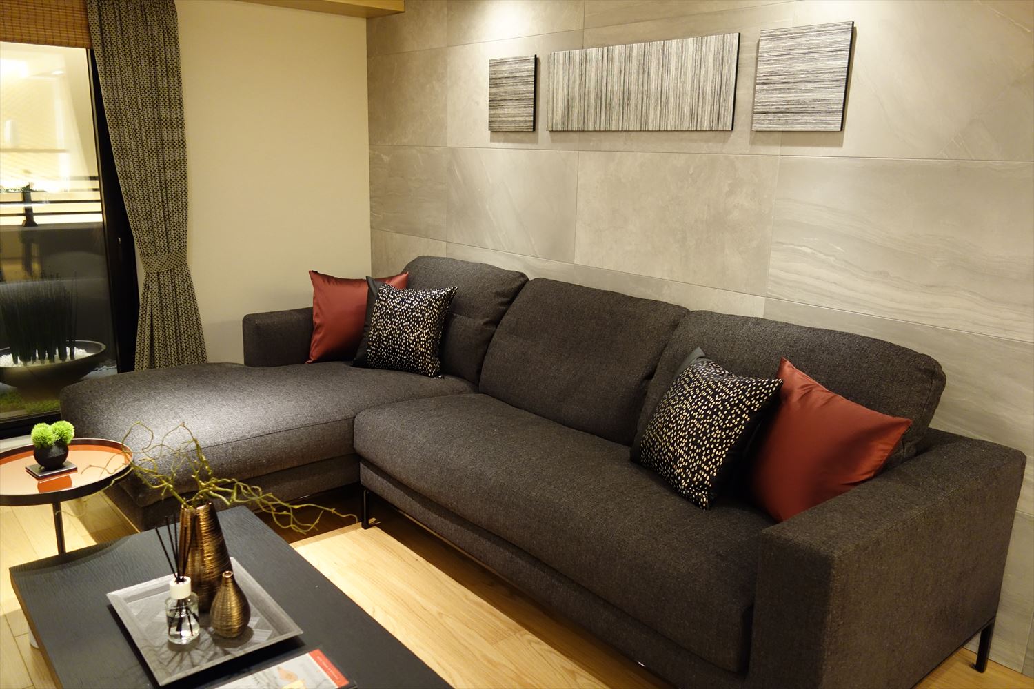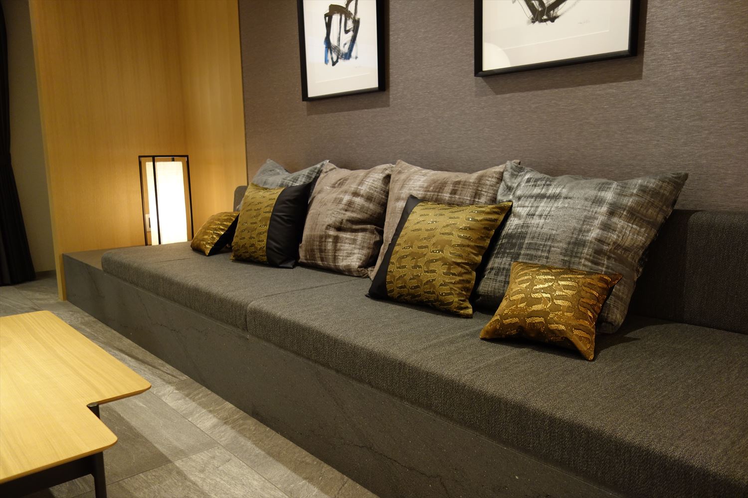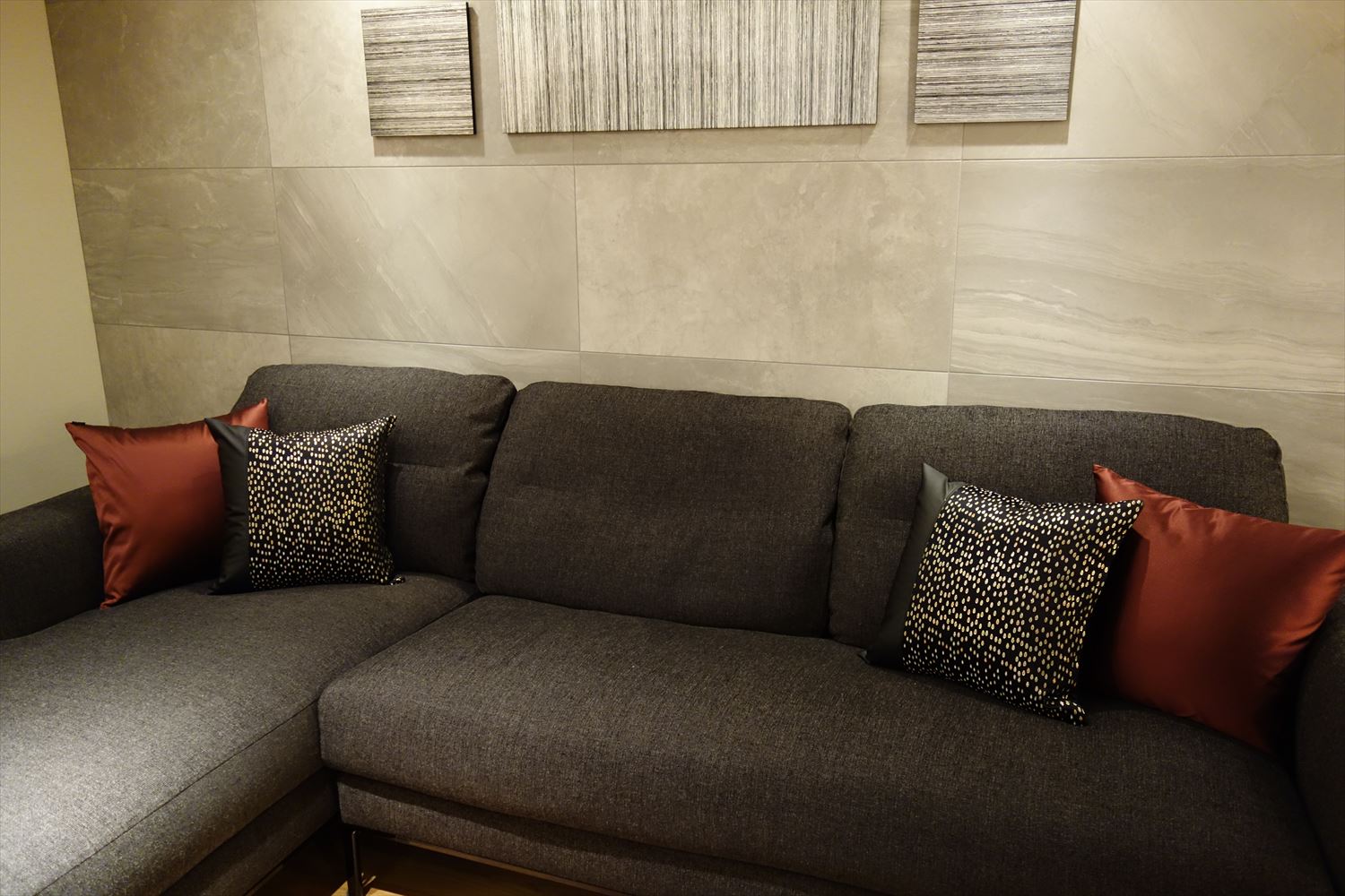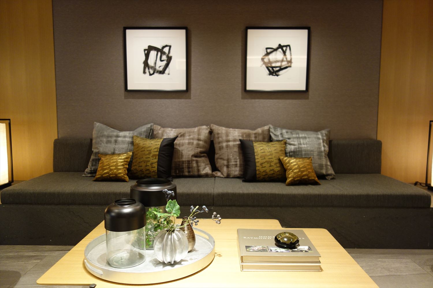 弊社オリジナルの 西陣織 金襴 滴紋様の絹織物をお使いいただいたクッションカバーがリビングをシックに彩ります。
