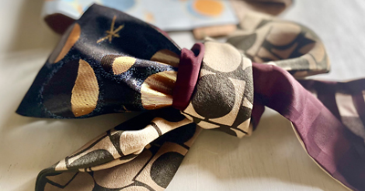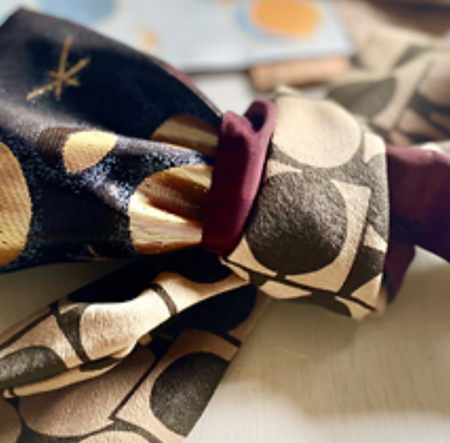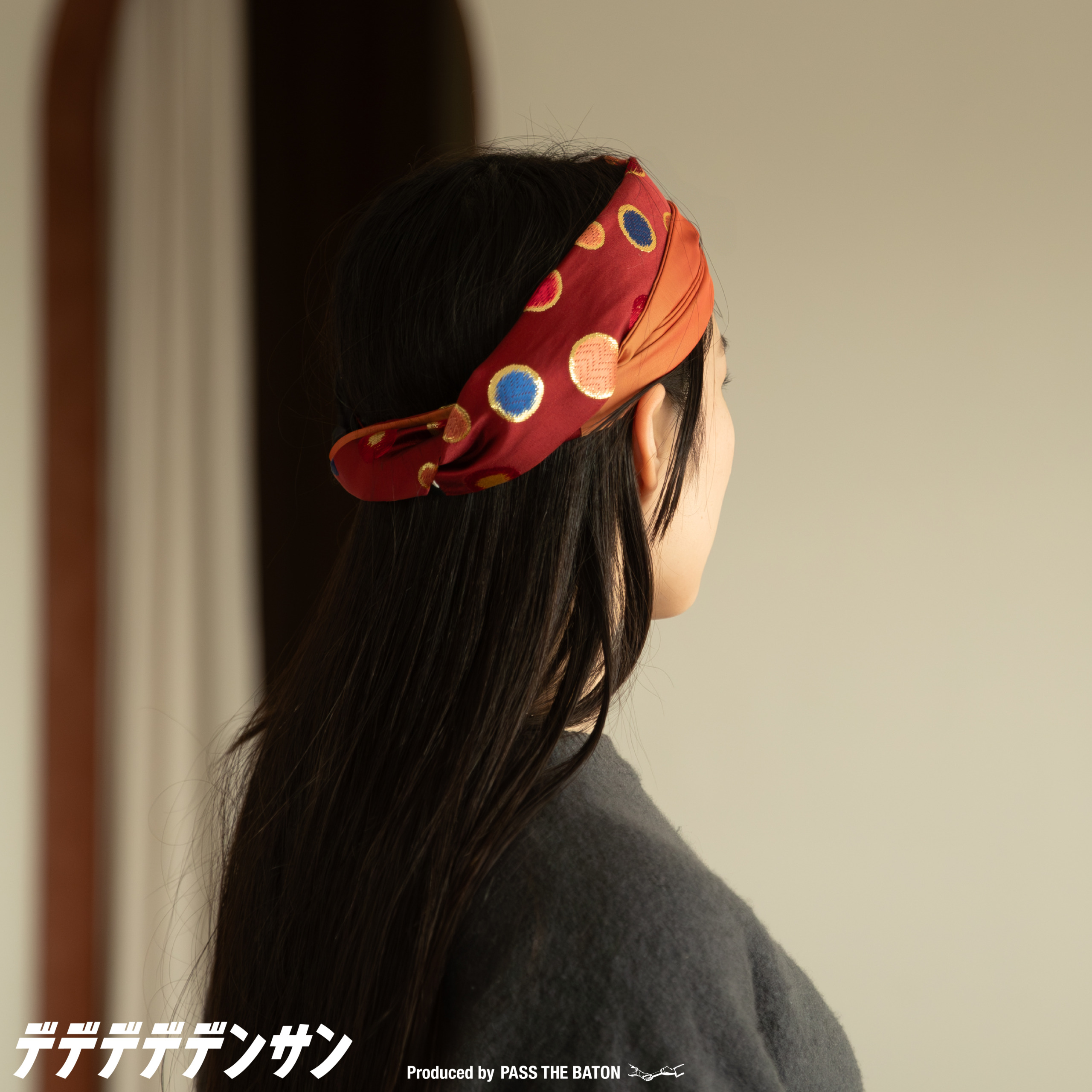 「岡本織物」は西陣織のなかでも「金襴」と呼ばれる寺社仏閣向けの高級織物を織ってきました。今回は金襴と世界中から集めた生地を組み合わせて作ったヘアターバン等を出品します。金色の糸が織りなす輝きをご覧ください。
