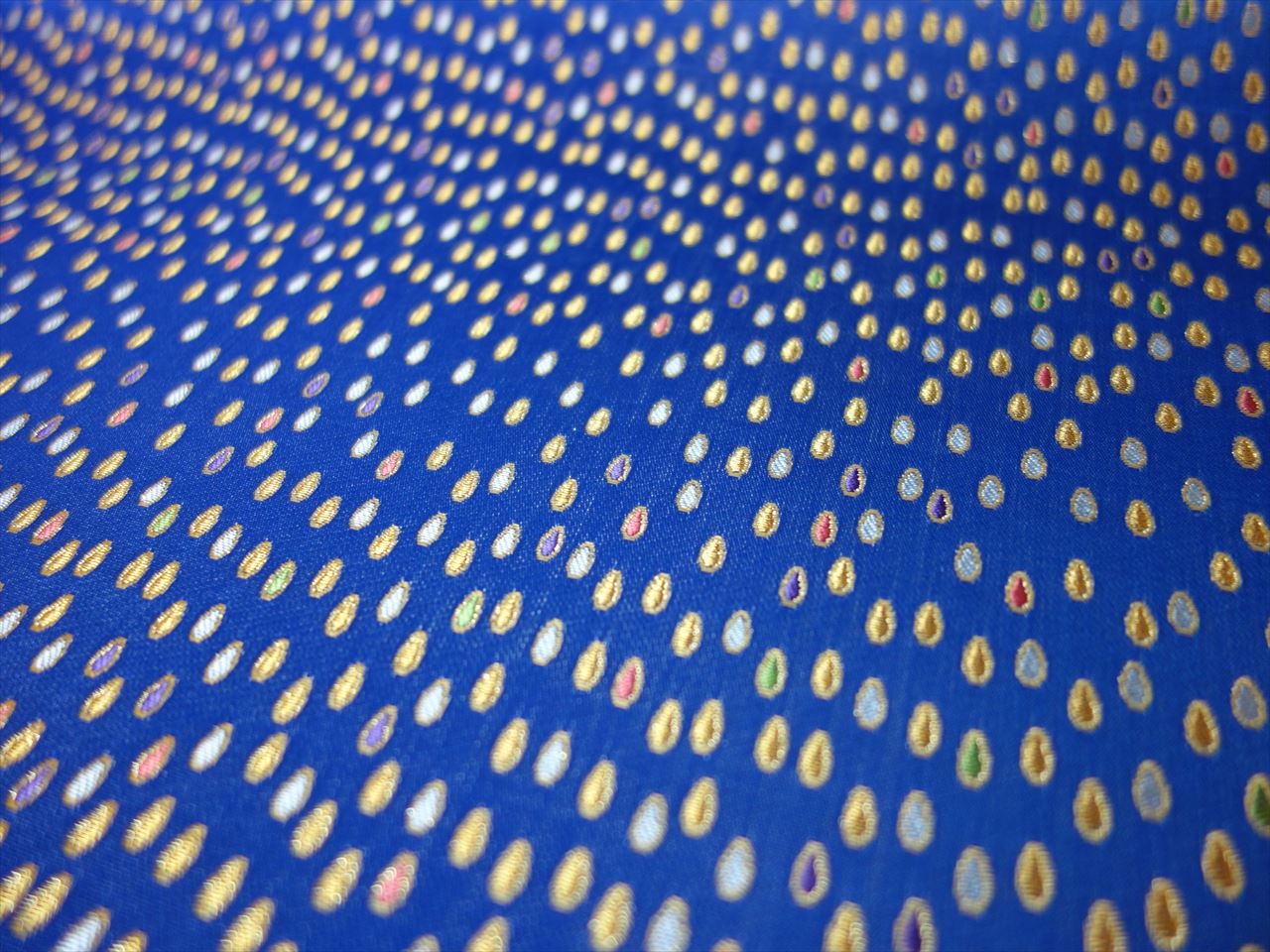 西陣織 絹織物 西陣織 金襴 滴紋様 説明 雨の日に雨粒の音を聞くのはとても気持ちの良い事です。 傘に当たる雨粒の音、傘の向こうに見える雨粒。 それはキラキラと光り、とても美しい。 そんな楽しい雨のような紋様を織りました。 西陣織 金襴関連商品