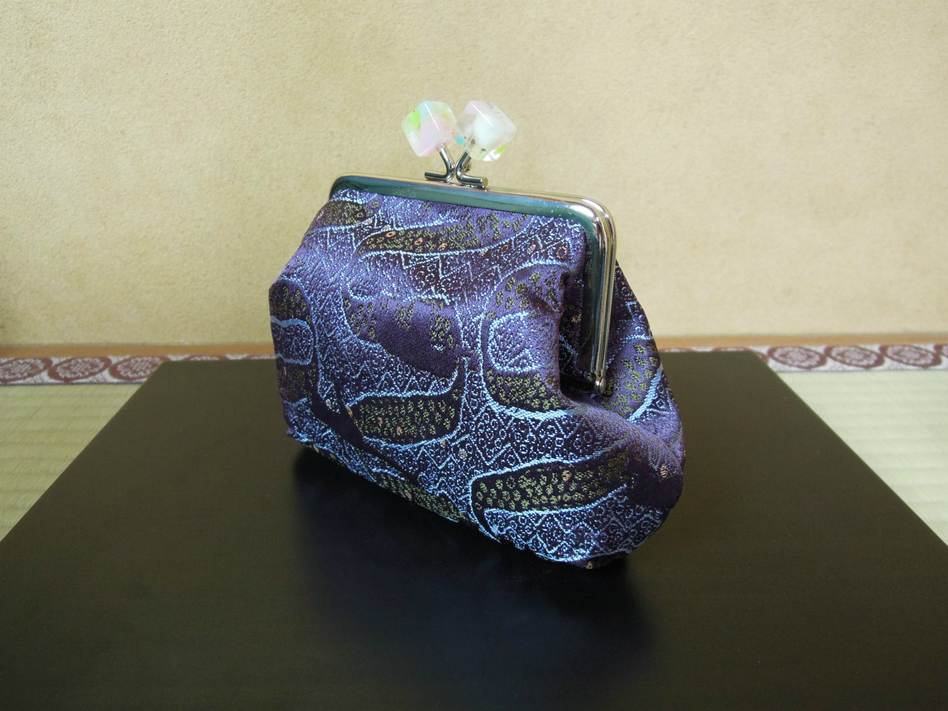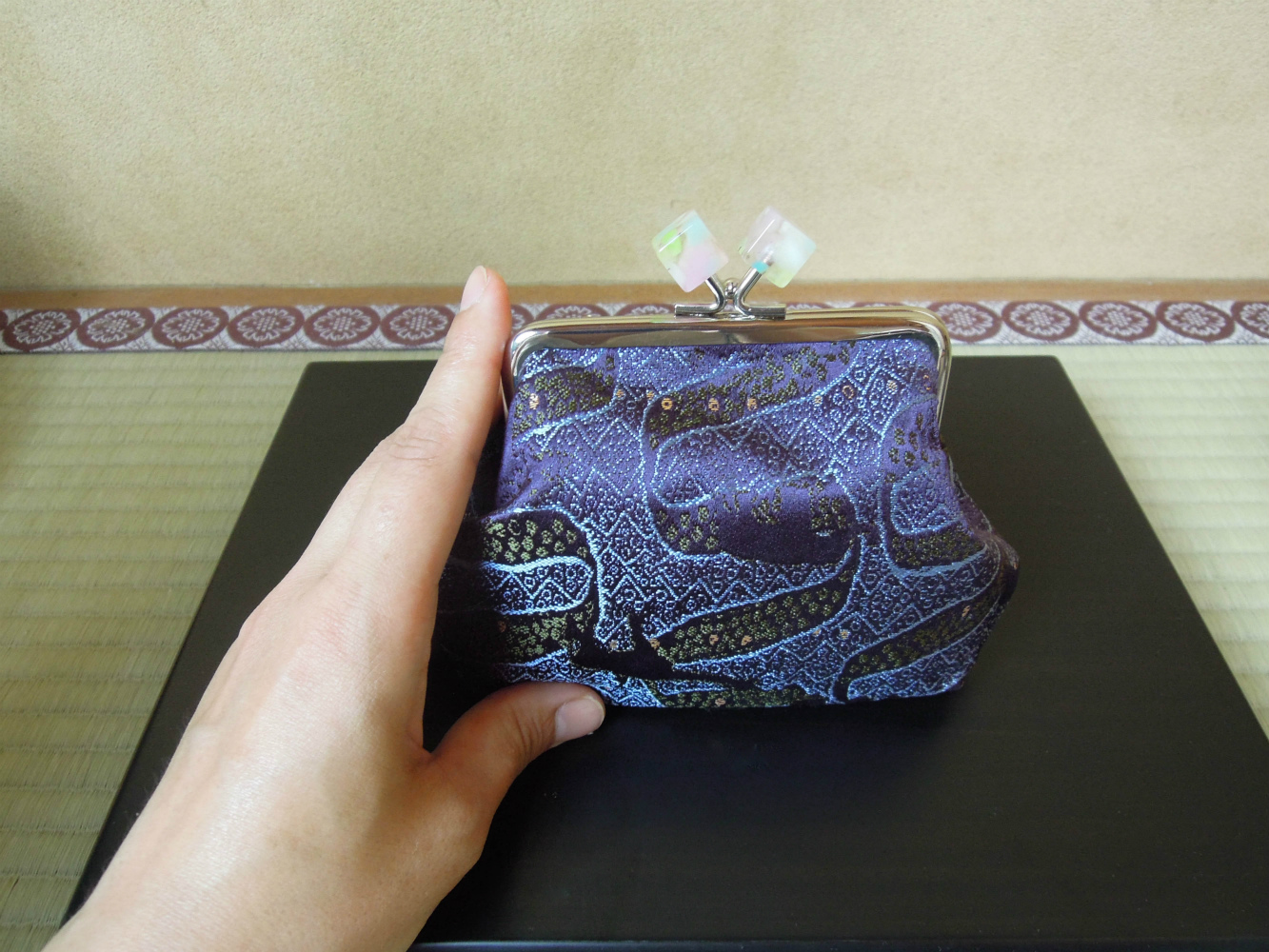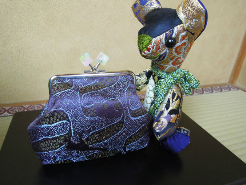 岡本織物です。西陣織の金襴織屋をしております。弊社の絹織物でがま口財布を御仕立ていたしました。