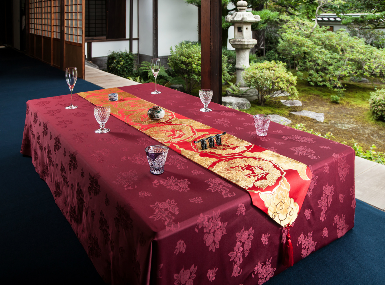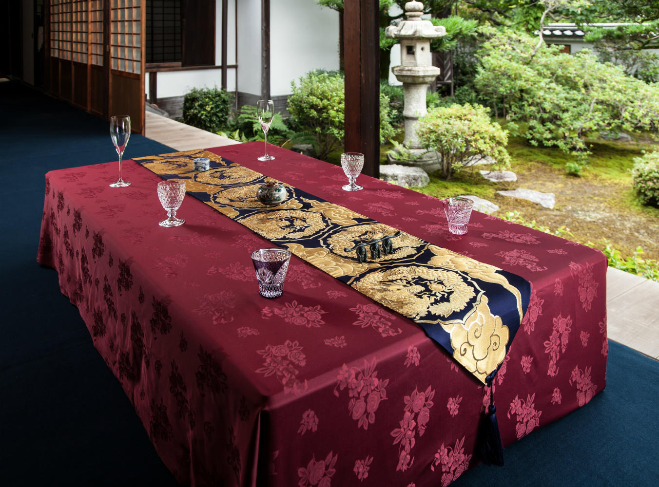 谷崎潤一郎は『陰翳礼賛』の中で、金襴の美しさは「薄暗がりの中で、ときどき少しずつ光る」ところだと書いています。金襴は現代での「大事な人をおもてなしする時間」を美しく彩る布です。