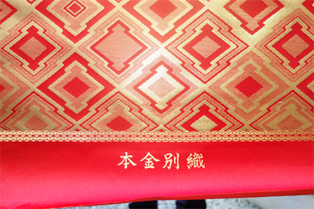 こちらは能登産21金本金箔を使用した本金引箔織りでございます。全正絹 西陣金襴 三階菱紋様の金襴地を使用しております。
