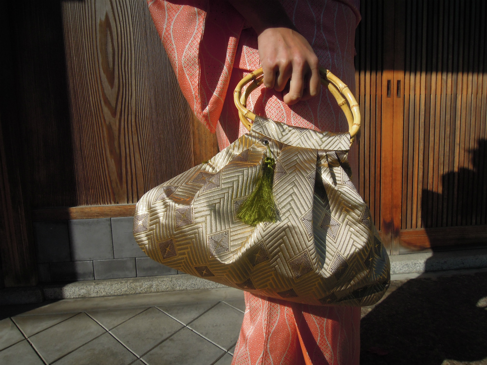 今日は我が社の金襴、全正絹 西陣織 金襴 菱繋ぎ紋様で蛤のような形の手提げバッグを作りました。