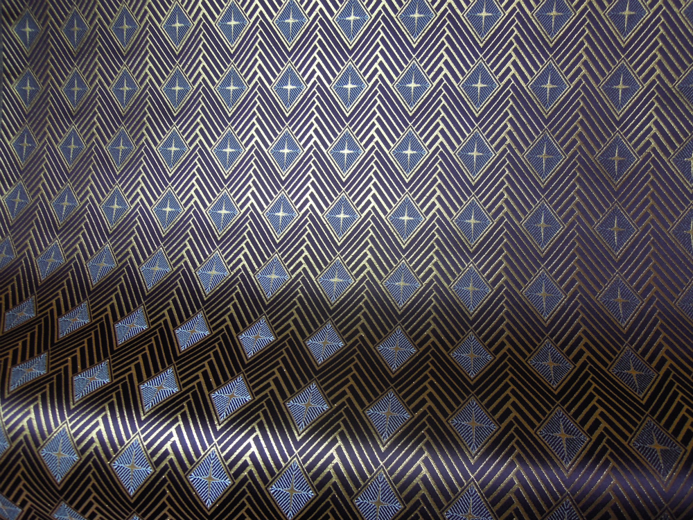網代紋様に松の葉の意匠の菱を組み合わせました。水辺の「菱の実」に似ていることので「菱型」と名づけられた「菱」に、古来より親しまれてきた松の葉を入れて松葉菱としました。繰り返される網代、ヒシは繁殖力が強く子孫繁栄の意味があり、松は常緑樹な事から長寿の意味。この布を身にまとう方々の家内安全、無病息災を祈っての布地です。古来より金は魔物を跳ね返す力を持つといわれていますので、このキラキラ☆で跳ね返していただけたらとも思っております。