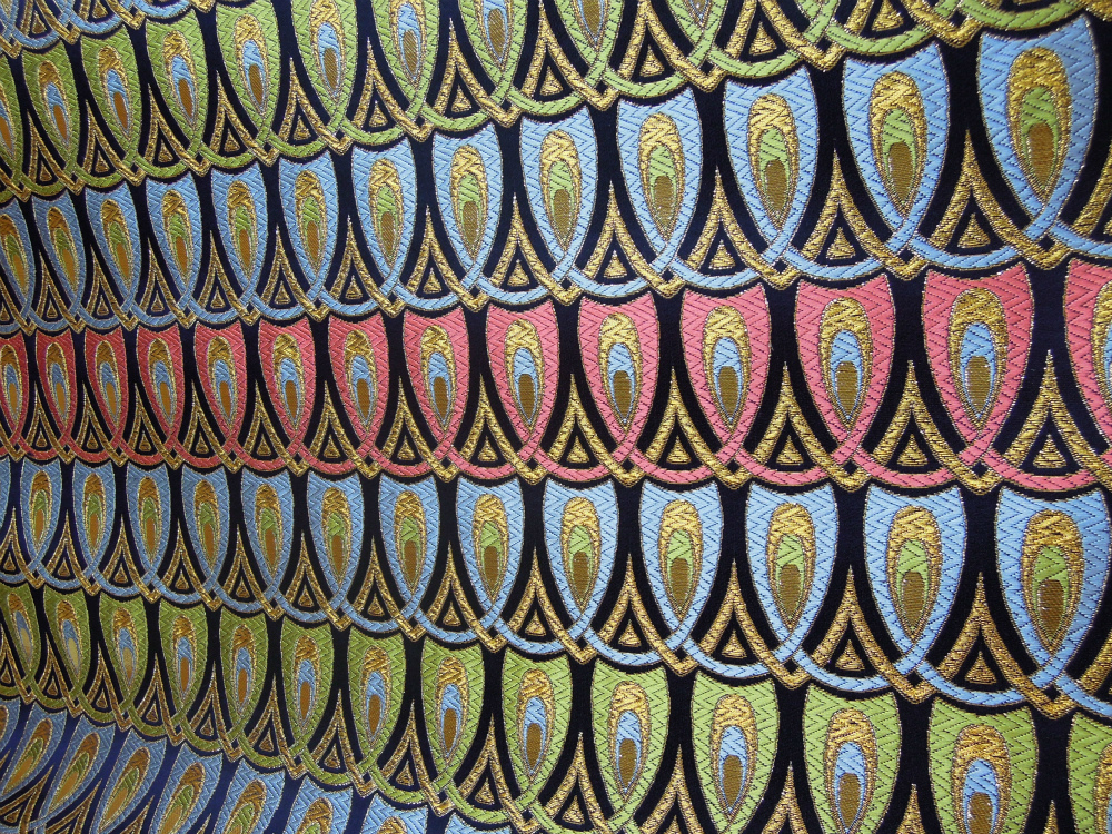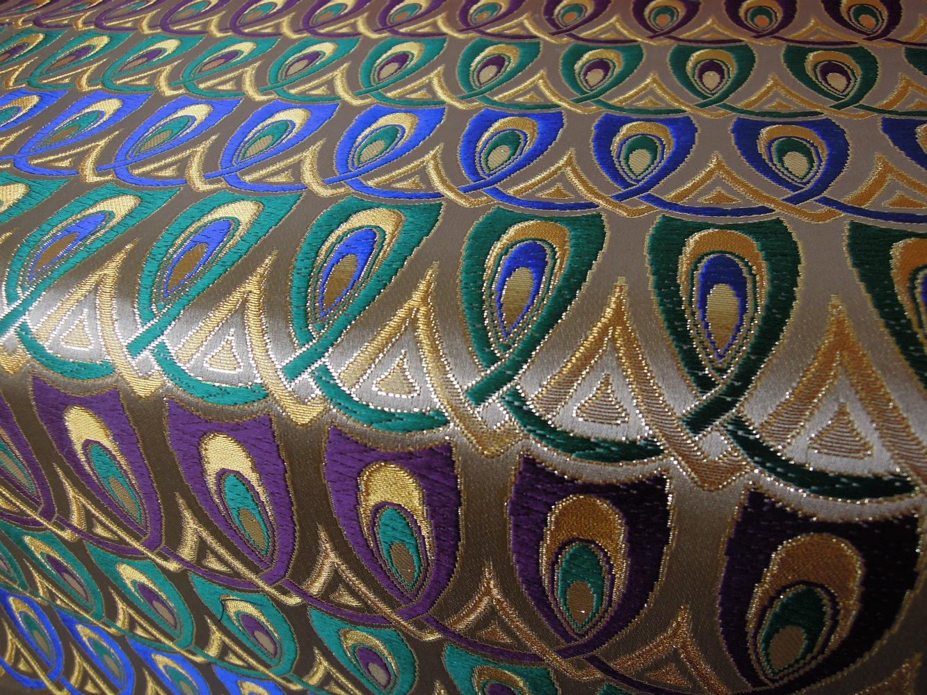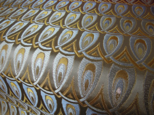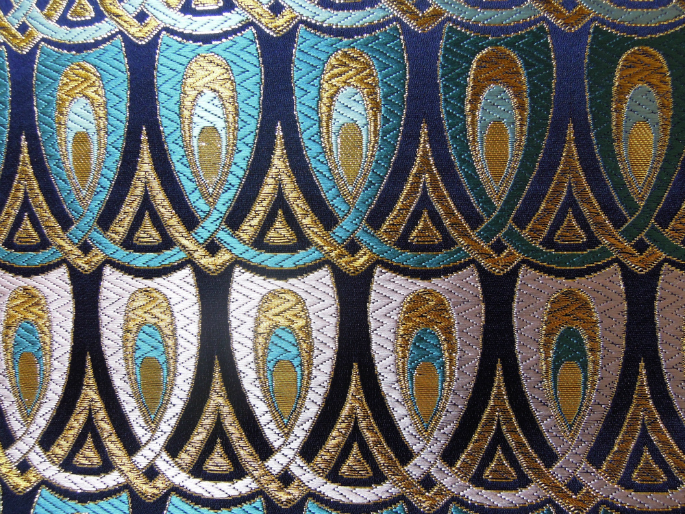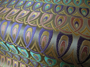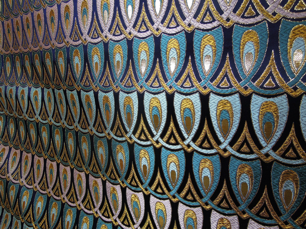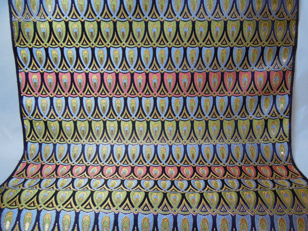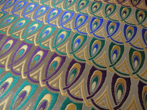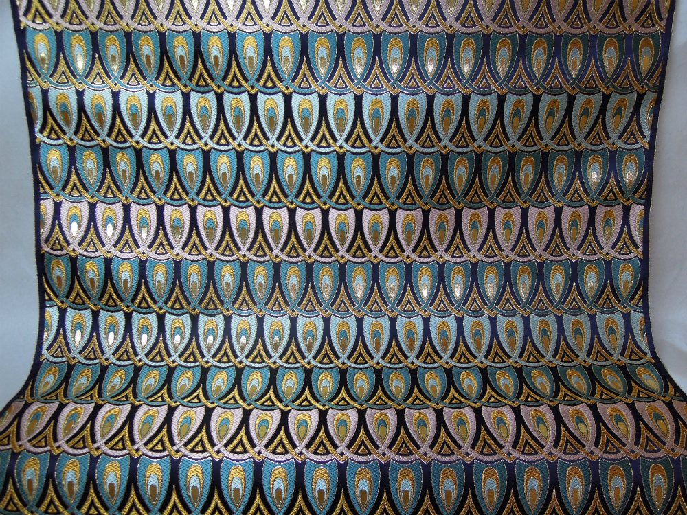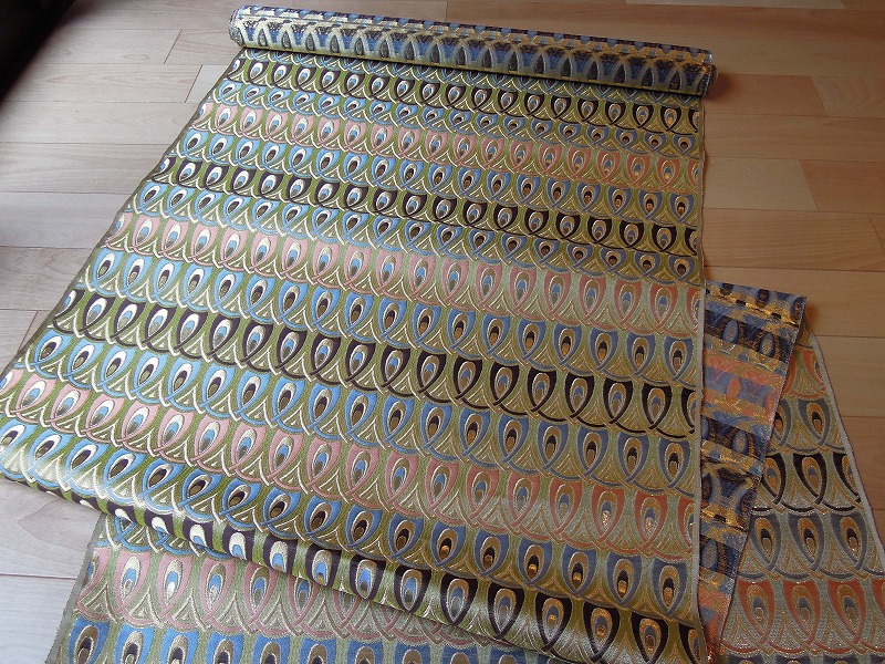 西陣織のテキスタイルデザイナーである筆者は孔雀の羽がとても好きです。孔雀の羽のような 西陣織 正絹 金襴 を織りたい。との思いで織りました。