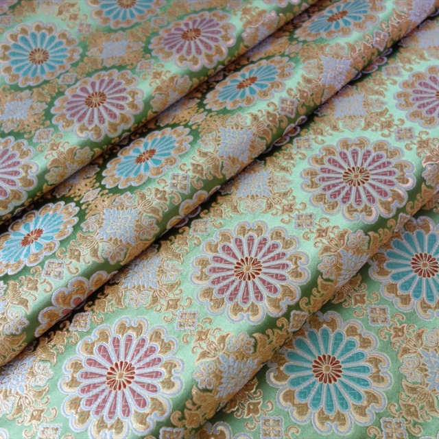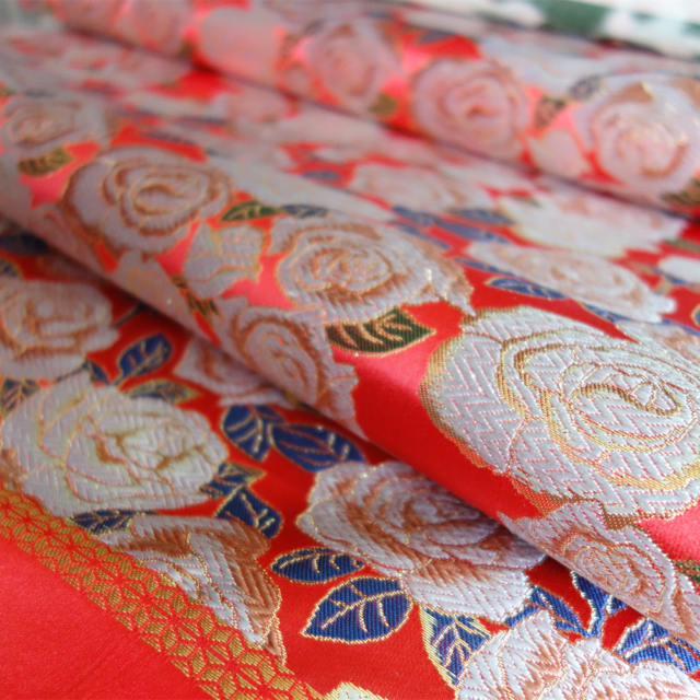 絵箔引箔で1レイヤー目、地紋を入れることで2レイヤー目、それに重なる絹の緯糸によるデザインで3レイヤー目と1枚の布地の中に奥行きのある表現が可能になります。