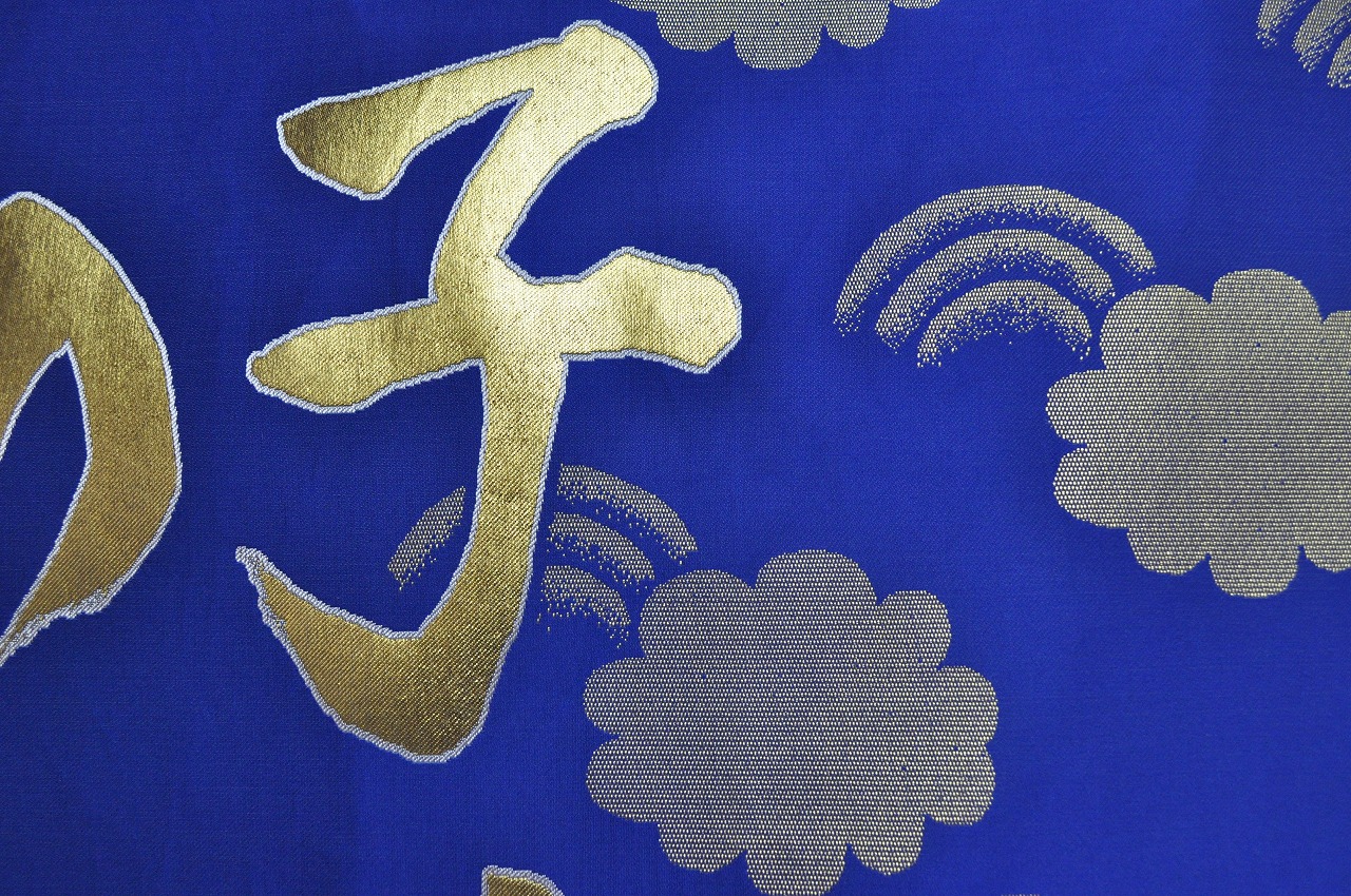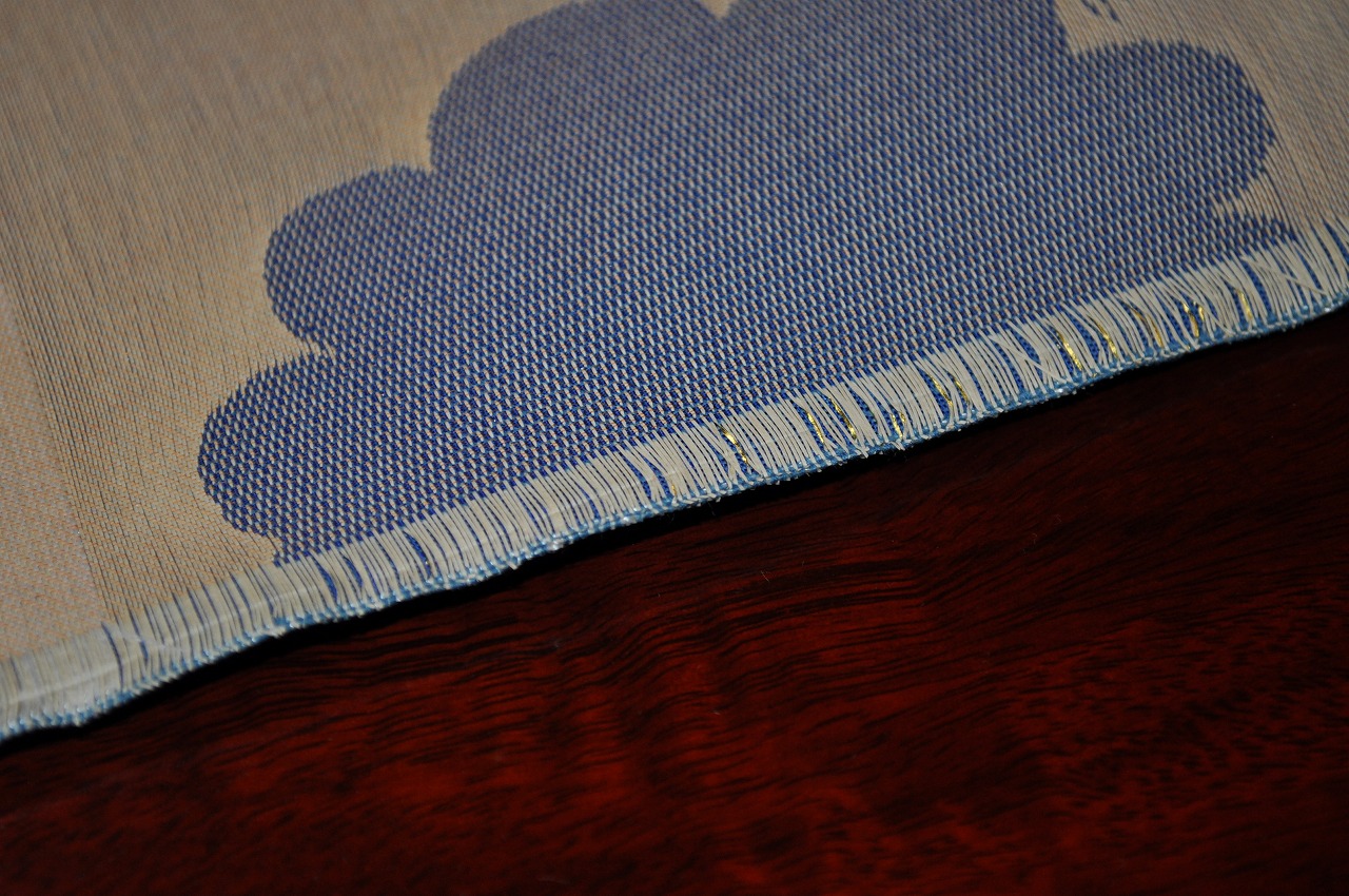 織地は錦。錦とは「綾織」の別名です。「錦の御旗」というのは「錦織の旗」というわけではなくて「朝廷側の軍の旗」という意味です。「錦の御旗」の多くは「日」「月」「菊」等が織り込まれています。そして「錦の御旗」の地組織は「緞子地(朱子=サテン)が多いよう。
