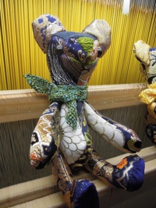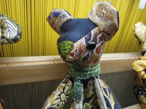 「僕のマフラーは鼻の色と同じ色が入ったマフラーなんだ。この国産正絹は江州(滋賀県)だるま糸だよ。すごくキュッキュッというキヌズレが聞こえるよ。片栗粉をもんだんとちゃうで~~。」