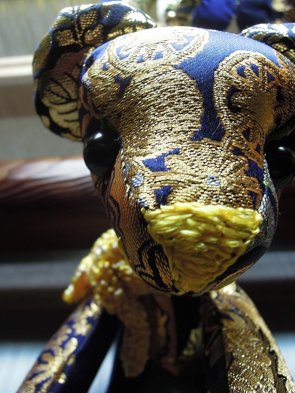 紺地の多種の金襴。お鼻は江州だるま糸。マフラーもだるま糸。