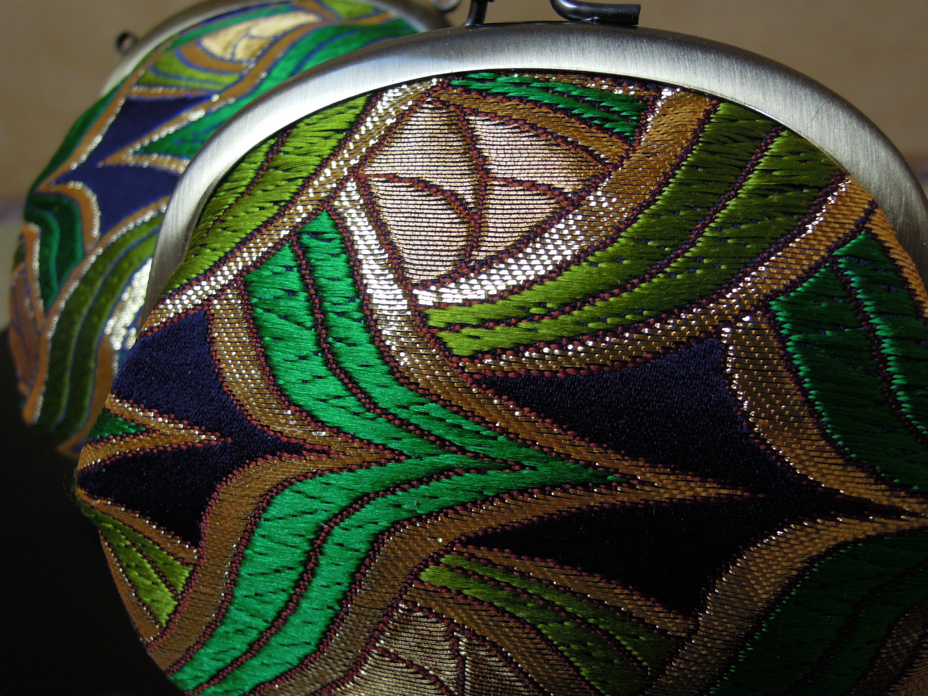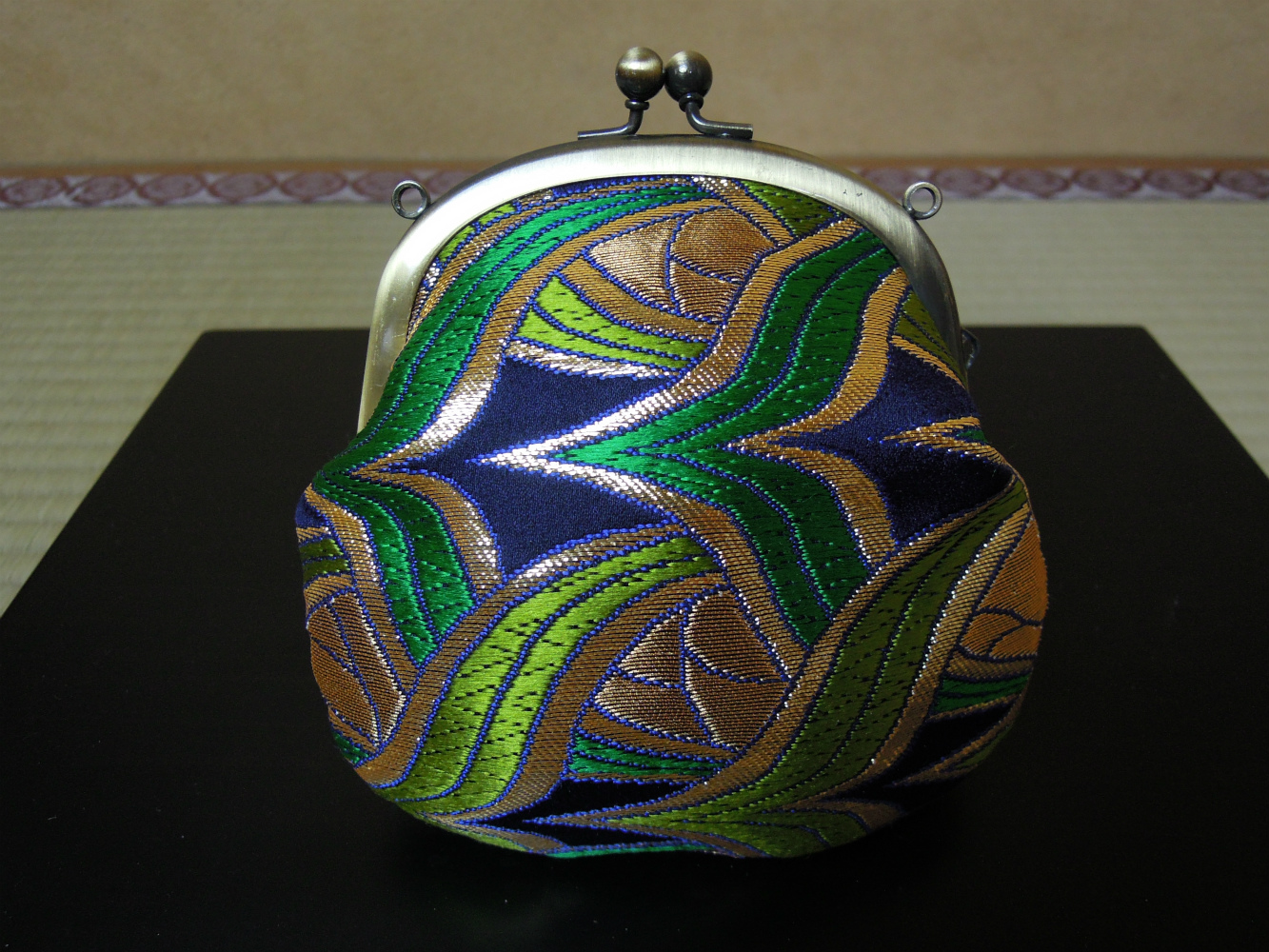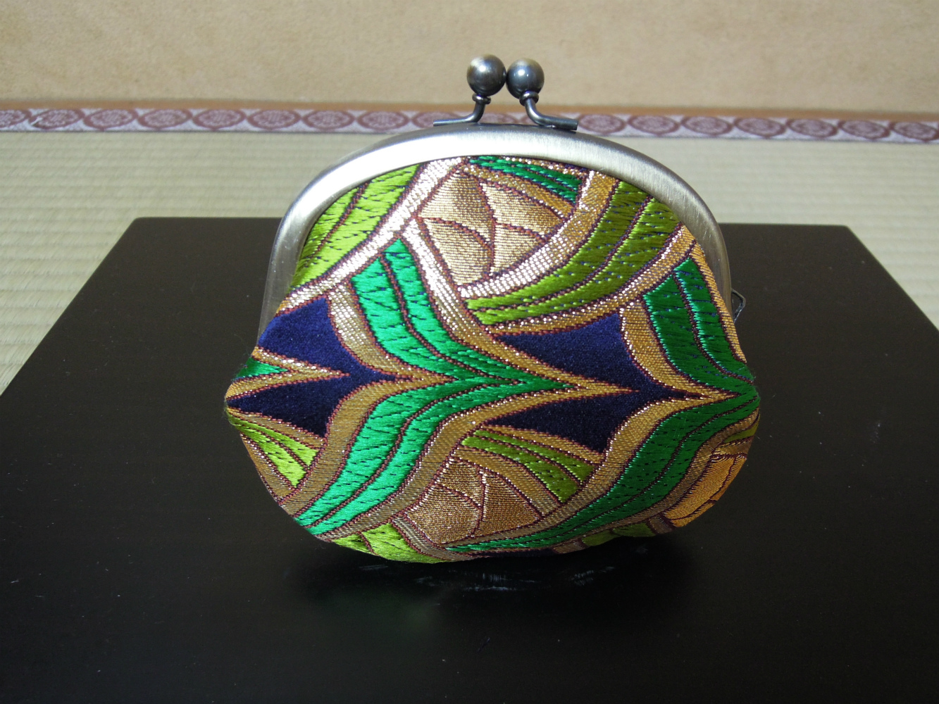 その全正絹 西陣金襴 燕矢紋様 十二釜でお仕立てしましたがま口。