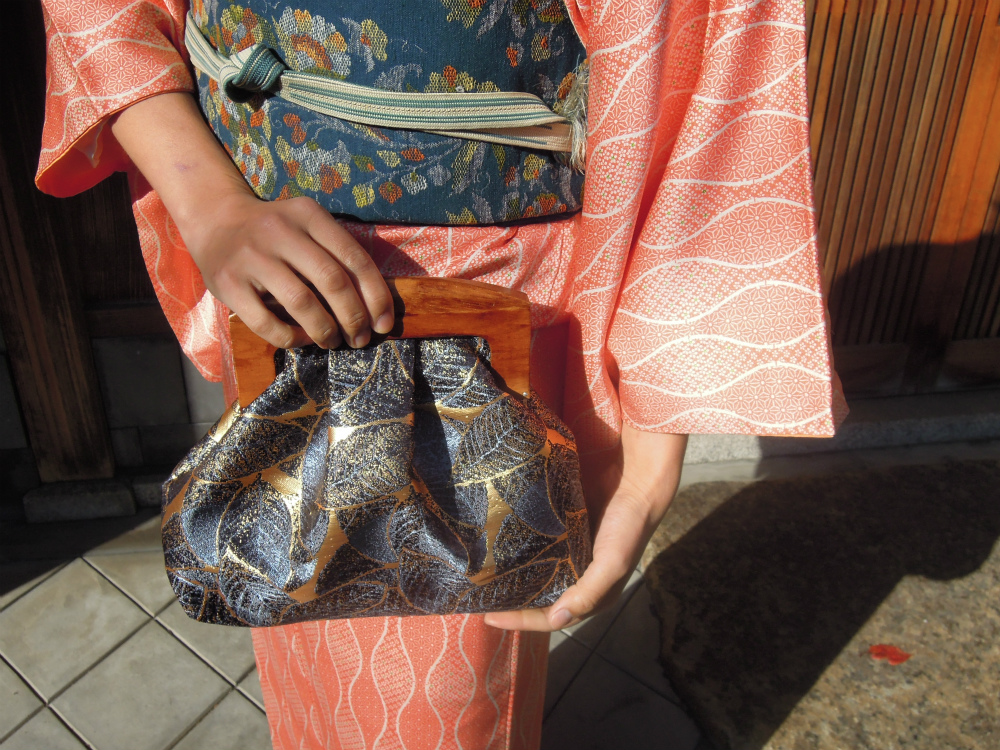 こちらは布地は正絹。箔は紛い金。持ち手部分は木製。木製の口金です。裏地は正絹。