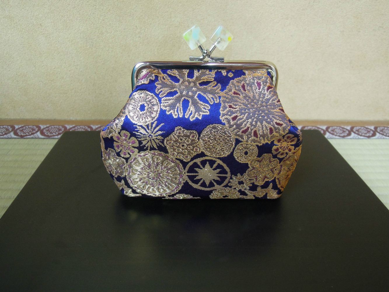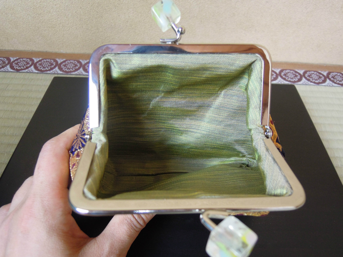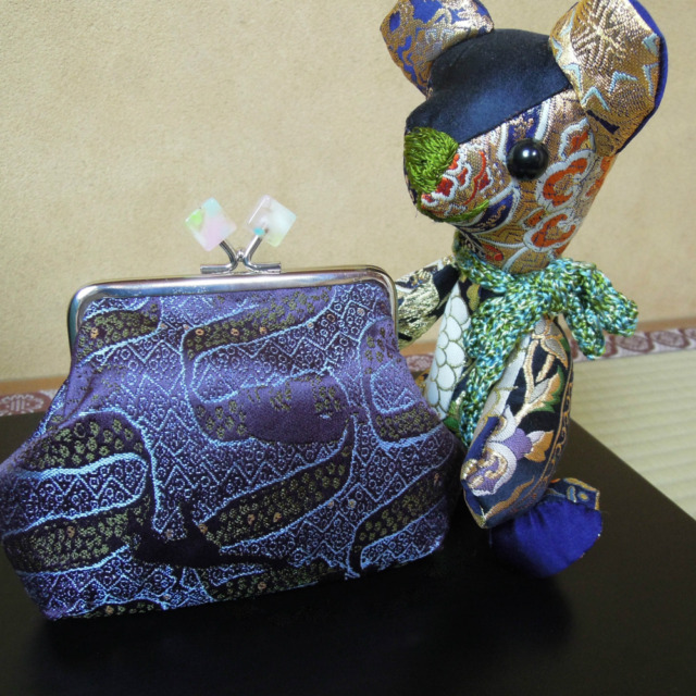 岡本織物です。西陣織の金襴織屋をしております。弊社の絹織物でがま口財布を御仕立ていたしました。