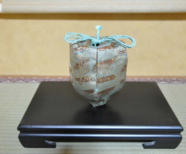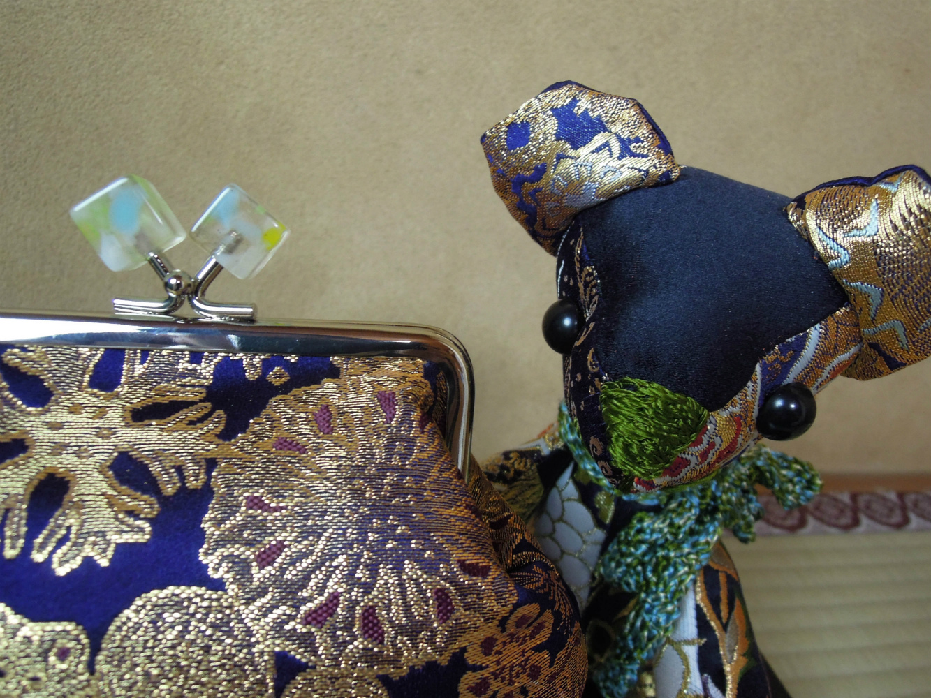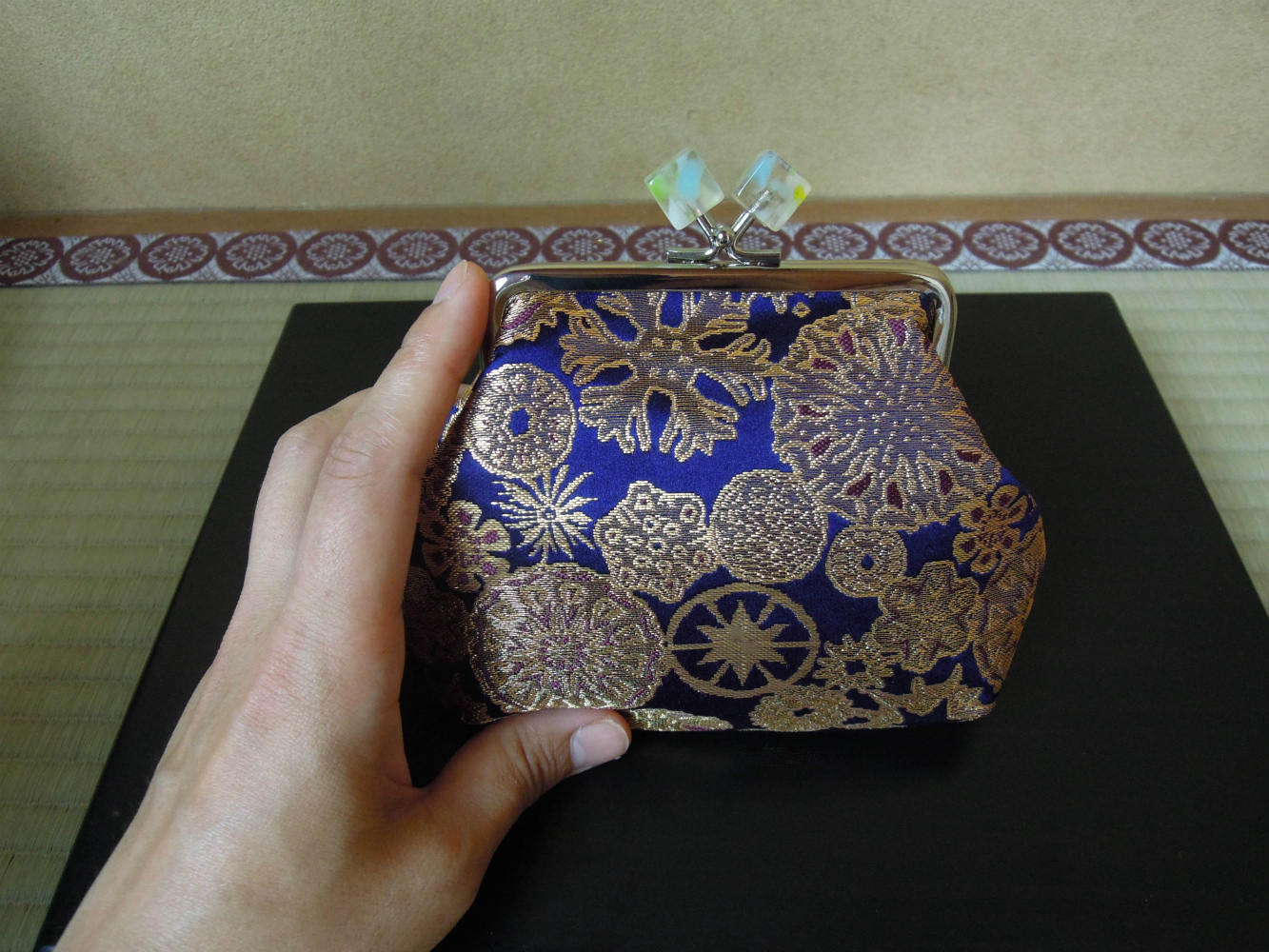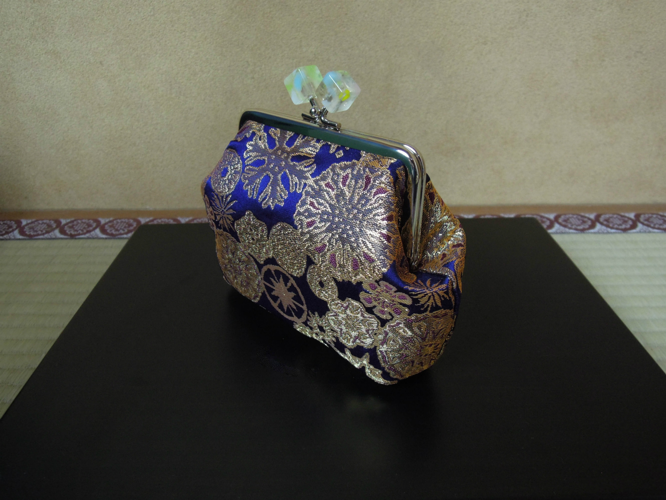岡本織物です。西陣織の金襴織屋をしております。弊社の絹織物でがま口財布を御仕立ていたしました。