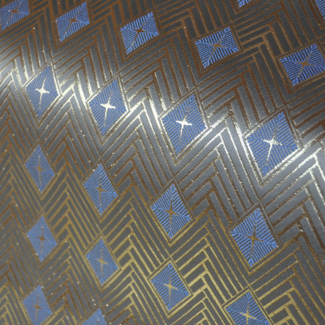 表地は弊社の金襴地、西陣金襴正絹 雪輪紋様の紺地、裏地も弊社の正絹地でございます。冬に空から降ってくる雪の結晶をご覧になられた事はありますか?あの軽やかで綺麗な雪の結晶で金襴地にしたいと思いました。